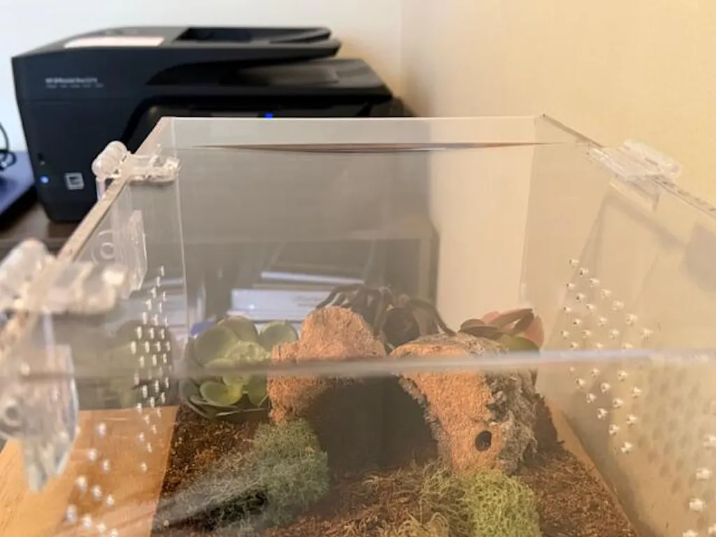 My mexican fireleg is finally large enough for an adult enclosure. I have three other adult enclosures form Jamie and they're all great! This one was no different: carefully shipped and wrapped to protect the acrylic. Plenty of substrate, water dish, silk plants, moss and even TWO freebies (cactus plant & more moss)!!!